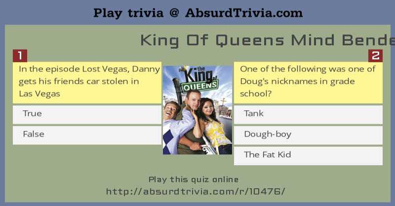 King Of Queens Trivia Questions And Answers / Alexander the great, isn't called great for no reason, as many know, he accomplished a lot in his short lifetime.. It covers over 70% of the planet, with marine plants supplying up to 80% of our oxygen,. Perhaps it was the unique r. Zoe samuel 6 min quiz sewing is one of those skills that is deemed to be very. If you fail, then bless your heart. Here's a rare nostalgia car for ho.